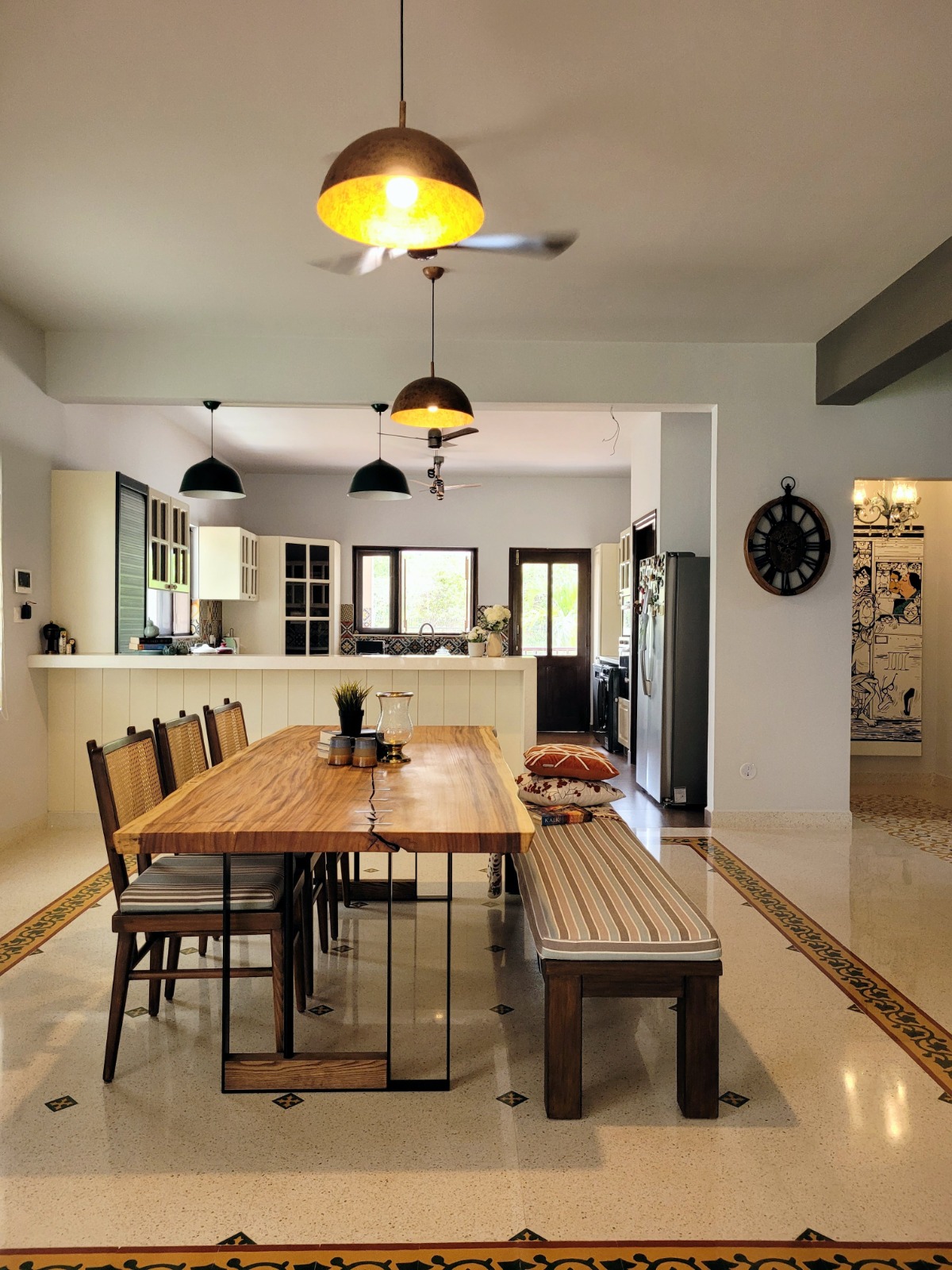 A barn house look was achieved through patterns in the handmade floor tiles, kitchen back splash etc.